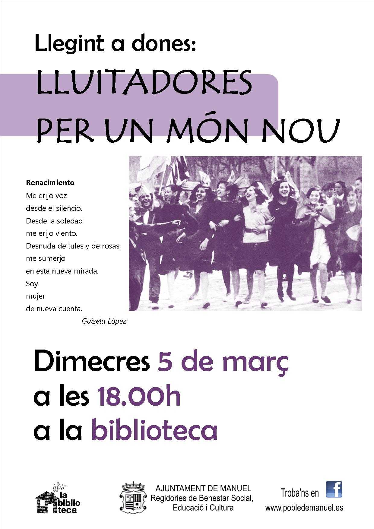 Enguany fa cinc anys que cada 8 de març, des de la biblioteca, organitzem el Llegint a Dones: 8 dones, conegudes i no tant, que han destacat o destaquen per alguna raó. Hem parlat de literatura universal, de dones de la República, dones de la Mediterrània, dones compromeses… i enguany, dones lluitadores per un món nou: dones de tota condició, pensament i lloc que pensen, diuen i lluiten per un món millor per a totes les persones, però incidint, per damunt de tot, en la millora de la vida de les dones.