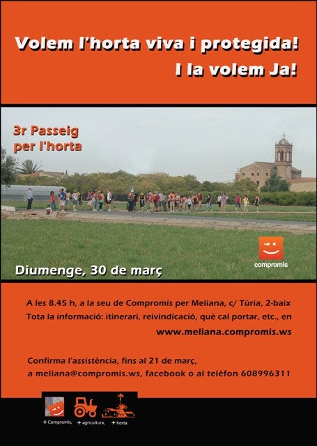 Com recorda Josep Riera, “el passeig va nàixer en ple debat sobre el Pla d’Actuació Territorial de Protecció de l’Horta de València, en què Compromís va participar activament, que el Partit Popular té paralitzat i amagat en un calaix des de fa 4 anys. El passeig servirà per a reivindicar este pla i la viabilitat de l’activitat agrícola de l’horta i mediterrània”. Amb esta finalitat, ja han confirmat la participació Jordi Sebastià, alcalde de Burjassot i cap de llista de Compromís al Parlament Europeu en les eleccions de maig, i la també candidata a Europa i exregidora de Compromís per Paterna, Loles Ripoll, en una activitat que té una dimensió comarcal i que suposa el primer acte de precampanya de les eleccions europees.