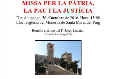 El diumenge 30 d’octubre, a les 12.00 hores, a l’església del Monestir de Santa Maria del Puig, se celebrarà la MISSA PER LA PÀTRIA, LA PAU I LA JUSTÍCIA