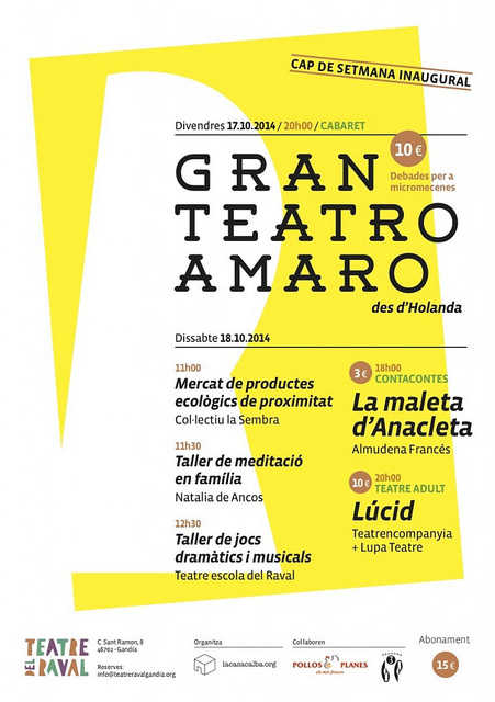 El cap de setmana inaugural continuarà dissabte 18 d’octubre amb una completa jornada per a disfrutar en família i que començarà a partir de les 11.00h amb un Mercat de productes ecològics de proximitat a càrrec del Col·lectiu la Sembra. Seguidament, a les 11.30h, s’iniciarà un Taller de meditació en família a càrrec de Natalia de Ancos i a les 12.30h, un Taller de jocs dramàtics i musicals a càrrec del Teatre escola del Raval. Aquestes activitats són debades i estan pensades per acostar el públic al cor i ànima d’aquest nou espai cultural de Gandia. Ja de vesprada, a les 18.00h, els menuts viatjaran amb la contacontes Almudena Francés i La Maleta d’Anacleta i a les 20.00h, teatre adult amb Lúcid de Teatrencompanyia + Lupa Teatre.