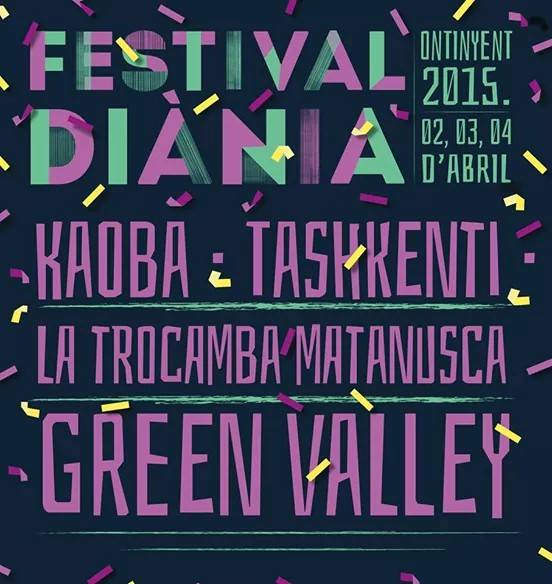 L’Assemblea de Joves Meruts d’Ontinyent anuncia la primera ronda de confirmacions del Festival Diània que enguany es celebrarà els dies 2, 3 i 4 d’abril. Aquesta primera tanda la composen els grups ontinyentins Kaoba, La Trocamba Matanusca i Tashkenti i la banda de reggae barcelonina Green Valley.