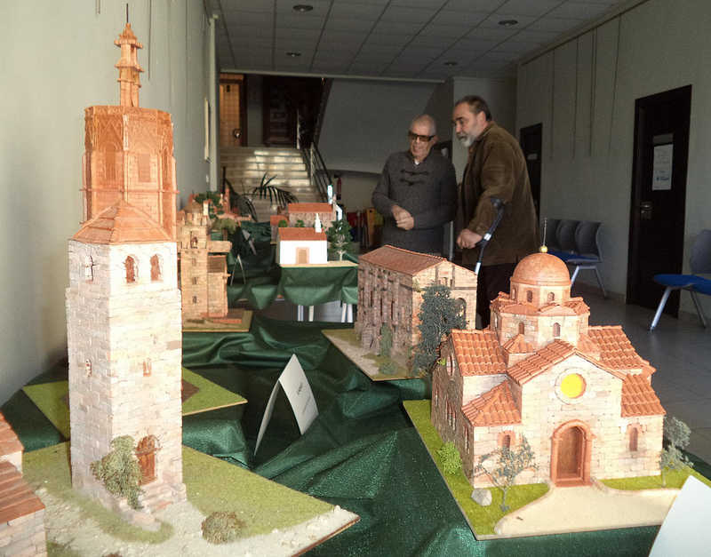 A l’entrada de l’Ajuntament d’Almoines hi ha una exposició de les ermites de la Safor en miniatura, fetes pel veí Pasqual Gardó, amb fang i pedres.