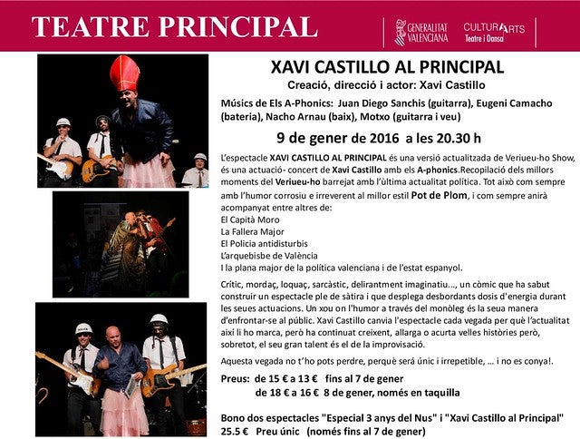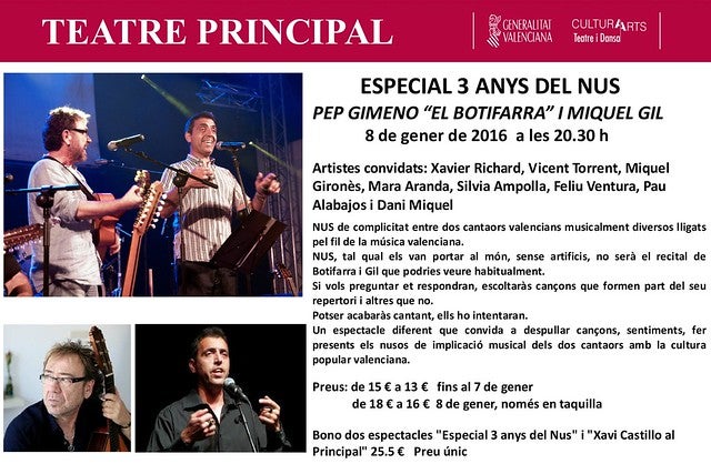 Pep Botifarra i Miquel Gil amb l’espectacle “Nus” i Xavi Castillo amb els A-Phonics, actuaran respectivament els dies 8 i 9 de gener, a les 20:30h al Teatre Principal de València.