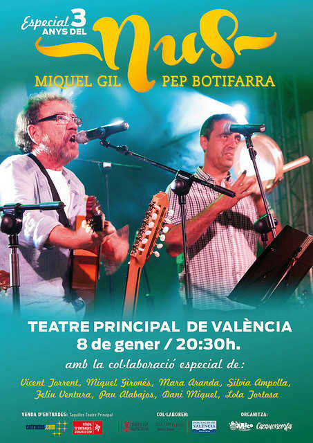 Els primers presentaran un “Especial 3 anys del Nus”. Un espectacle didàctic, divertit i musical, en el qual, desprès de 3 anys acompanyats solament per les veus de Gil, Botifarra i una guitarra.., aprofitaran per rodejar-se d’una bona colla d’artistes que han tingut molt a veure amb açò de la regeneració del valor de la música tradicional i també de la música feta en en la nostra llengua.