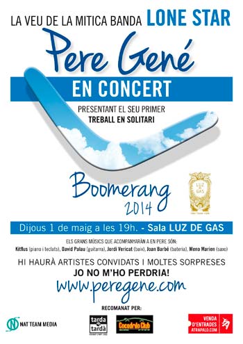 Pere Gené, membre fundador del mític grup de rock Lone Star, i un dels músics més reconeguts del nostre país, presenta el seu primer treball discogràfic en solitari, Boomerang. Amb aquest disc, el músic i compositor català marca un punt d’inflexió en la relació que l’ha unit sempre als seus fans i amics.
