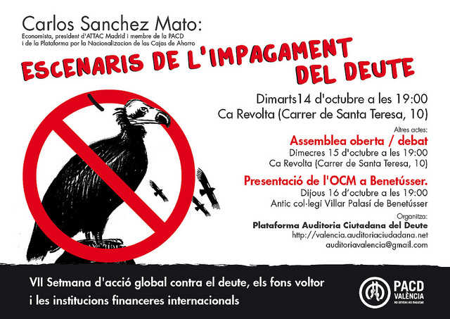 “Escenaris d’impagament del deute”, xerrada a càrrec de l’economista Carlos Sánchez Mato, professor en la UCM, president d’ATTAC Madrid i membre de la PACD i de la “Plataforma por la Nacionalización de las Cajas de Ahorros”. Ca Revolta (C/ Santa Teresa, 10, Valencia), 19h.