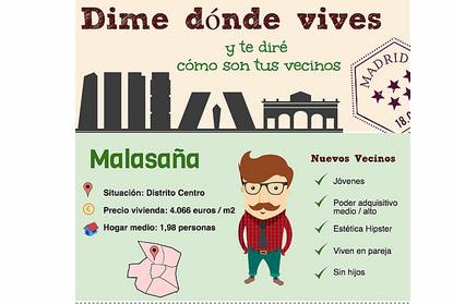 -Malasaña: la zona que fou bressol de la Moguda madrilenya als anys 80 del segle XX va estar durant anys marcada per l’estigma de la prostitució i la droga, el que va provocar la devaluació del seu parc d’habitatges. Atrets pels preus baixos de la zona van anar arribant nous veïns i, en paral·lel, algunes obres (com la rehabilitació de la caserna de Comte Duc) van ajudar a impulsar la renovació urbana. Els habitatges també s’han revaloritzat (un 23,3% en tres anys, sent la zona del districte amb un augment de preus) i els veïns de tota la vida (molts d’ells majors de 65 anys) han anat deixant pas a nous col·lectius urbans. És el cas dels anomenats Hipsters. Ara, el perfil més habitual a Malasaña és el d’un jove, d’entre 25 i 45 anys, amb estudis superiors, consumidor habitual de cultura i que viu en parella però encara sense fills (la llar mitjana està format per 1,98 persones) .