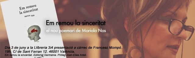 El 3 de juny de 2014 Presentació del meu poemari “Em remou la sinceritat”, en la Llibreria 3i4 de València. Presentació de luxe a càrrec de Francesc Mompó i recital de poemes de la mà d’amics i poetes. Mariola Nos Castelló de la Ribera