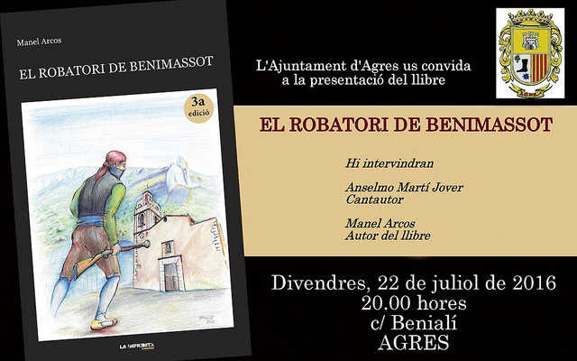 Aquest divendres 22 de juliol de 2016 A les 20.00 h Xerrada sobre el meu llibre El robatori de Benimassot al c/ Benialí d’Agres. El cantautor Martí Jover obrirà i tancarà l’acte. Manel Arcos i Martínez