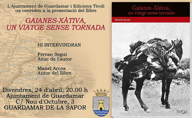 Divendres, 24 d’abril de 2015, a les 20.00 h, presentaré el meu nou treball d’investigació, titulat Gaianes-Xàtiva, un viatge sense tornada