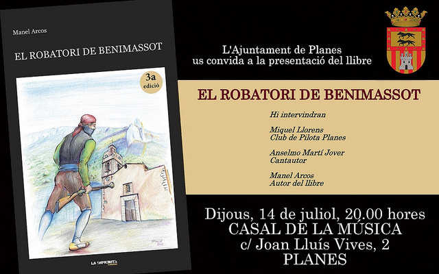 Dijous 14 de juliol de 2016 A les 20.00 h Xerrada sobre el meu llibre El robatori de Benimassot Al Casal de la Música de Planes (c/ Joan Lluís Vives, 2). El cantautor Anselmo Martí Jover obrirà i tancarà l’acte. Manel Arcos i Martínez