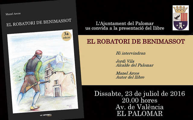 Aquest dissabte 23 de juliol de 2016 A les 20.00 h Xerrada sobre el meu llibre ‘El robatori de Benimassot’ A l’avinguda de València del Palomar. Introduirà l’acte l’alcalde del Palomar, Jordi Vila. Manel Arcos i Martínez
