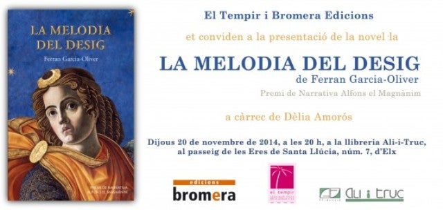 La melodia del desig de Ferran Garcia-Oliver, Premi de Narrativa en Valencià Alfons el Magnànim 2013. Dèlia Amorós serà la persona encarregada de presentar-lo a Ali-i-Truc el pròxim 20 denovembre a les 20 h. Escrit amb un llenguatge ric i sumptuós