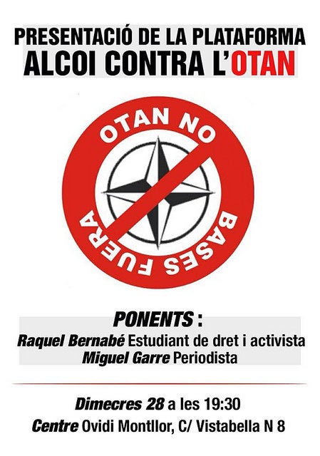 El poble alcoià ha protagonitzat al llarg del temps grans lluites contra les guerres imperialistes, encara que no van tenir la necessària continuïtat. En els moments actuals, davant el preocupant escenari bèl·lic mundial, diverses organitzacions polítiques, sindicals i socials hem assumit la determinació d’engegar la plataforma contra l’OTAN d’Alcoi; un pas necessari i urgent, que partint de l’experiència acumulada, renaix des de la convicció, que l’OTAN mai fou creada per garantir l’estabilitat i defensa dels valors democràtics o la sobirania dels pobles. Per contra, la història ens demostra, que fou creada des de centres de poder imperialistes per a imposar a sang i foc un ordre mundial dominat per les multinacionals, amb capacitat per a intervindre contra qualsevol poble que volguera construir un altre model econòmic i social contrari als seus interessos.