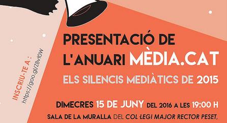 Un any més, ACICOM organitza la presentació de l’Anuari Mèdia.cat . Els silencis mediàtics de 2015. . Dimecres, dia 15 de juny a les 19:00 h. a la Sala de la Muralla del Col·legi Major Rector Peset, de la Universitat de València. Pl. Forn de Sant Nicolau, 4. 46003 VALÈNCIA Presenta i modera: Jose Ignacio Pastor , President ACICOM Intervenen: Joan Canela, Editor de l’Anuari Mèdia.cat Adolfo Carratalà, soci d’ACICOM i Professor de Comunicació d ela Universitat de València. Isabel Villar, periodista i autora de l’article L’assassinat de la transsexual Lyssa. Alec Casanova, Vocal Trans de Lambda València David Pardo, HubCívic.