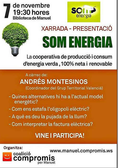 I ens explicarà l’alternativa que proposa SOM ENERGIA, una cooperativa sense ànim de lucre, d’energia 100% neta i renovable, que ens permet als consumidors finals consumir energia verda (lliure d’energies fòssils, nuclears, brutes), i mitigar dins de les nostres possibilitats el canvi climàtic sense que això supose un encariment de la nostra factura de la llum.