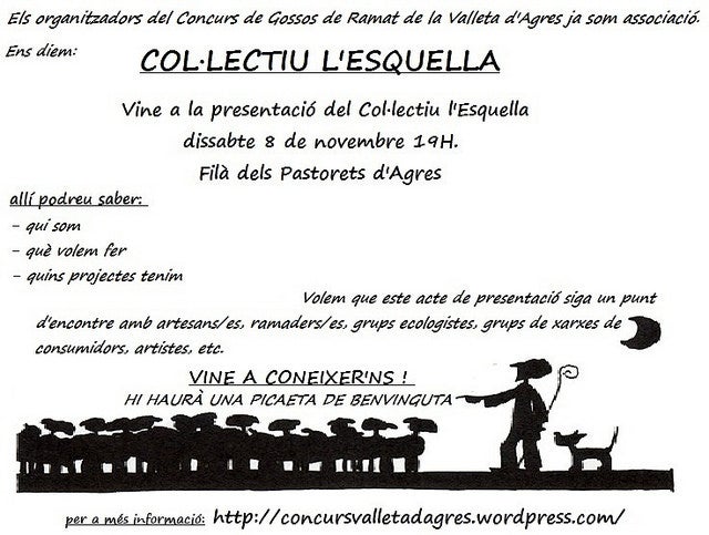 Ens diem Col·lectiu L’Esquella i a banda de fer el Concurs de Gossos com a activitat principal, també estem començant a organitzar altres activitats culturals,exposicions, encontres, manifestacions i altres tradicions vinculades amb la ramaderia tradicional, l’agricultura i el territori de la Valleta d’Agres i comarques centrals ,per un desenvolupament humà, rural i sostenible.