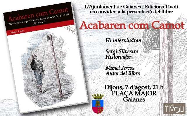 El dijous, 7 d’agost de 2014, a les 21.00 h, presentaré el meu treball d’investigació, titulat Acabaren com Camot: bandolerisme a la governació de Xàtiva en temps de Ferran VII (1814-1833)