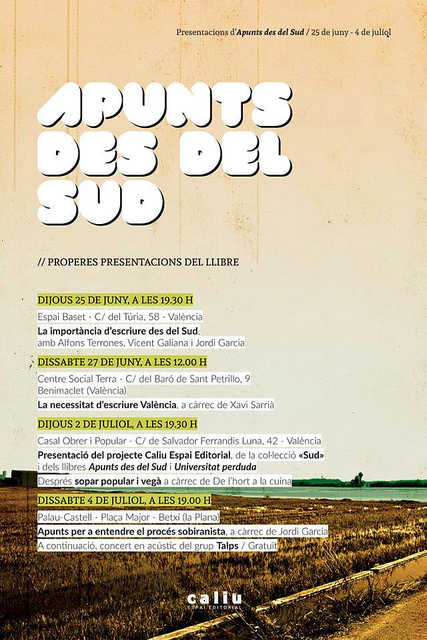 Comptarem amb Jordi Garcia, membre de Caliu Espai Editorial que ens presentarà el llibre juntament amb dos companys més; Alfons Terrones dels Joves pel Dret a Decidir i Vicent Galiana ex-militant del Sindicat d’Estudiants del Països Catalans. Vos convidem a assistir i participar del interessant debat.