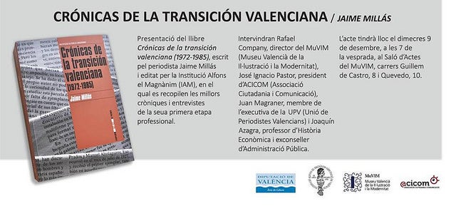 El llibre, titulat Cròniques de la Transició Valenciana (editorial Alfons El *Magnànim), serà presentat el dimecres 9 de desembre en el Museu Valencià de la Il·lustració i de la Modernitat (MuVim) pel seu director, Rafael Company, el president de l’associació Acicom, José Ignacio Pastor, el periodista Juan Magraner i l’exconseller i professor Joaquín Azagra.
