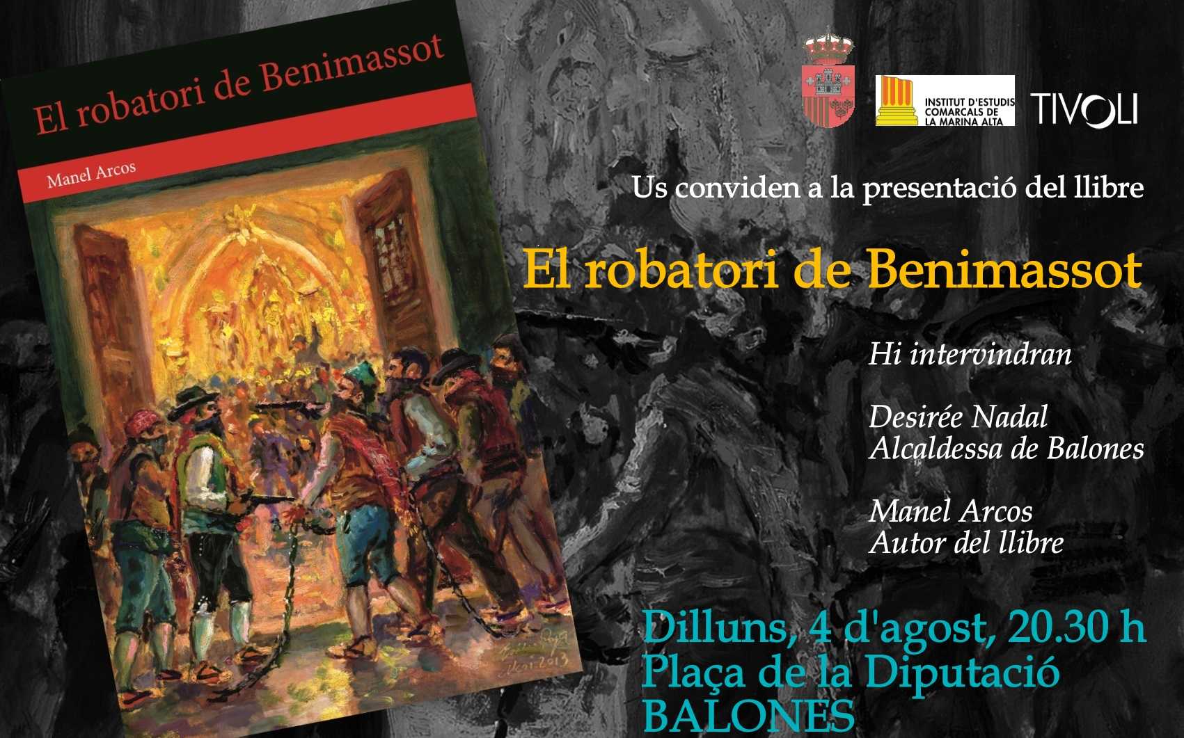 Dilluns, 4 d’agost de 2014, a les 20.30 h, presentaré el meu darrer treball d’investigació, titulat El robatori de Benimassot A la plaça de la Diputació de Balones. Introduirà l’acte l’alcaldessa de Balones, Desirée Nadal. Manel Arcos i Martínez Canals