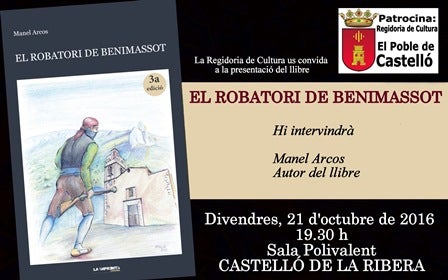 Presentació a CASTELLÓ DE LA RIBERA del llibre EL ROBATORI DE BENIMASSOT Aquest divendres, 21 d’octubre de 2016 A les 19.30 h Xerrada sobre el meu llibre ‘El robatori de Benimassot’ A la Sala Polivalent de Castelló de la Ribera. Manel Arcos
