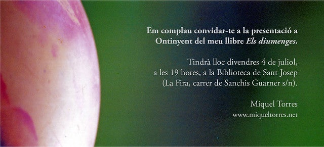 Els diumenges, el nou llibre de Miquel Torres, serà presentat a Ontinyent proper divendres 4 de juliol. El lloc triat és la biblioteca de Sant Josep (carrer de Sanchis Guarner s/n); durant la presentació, l’autor estarà acompanyat per Vicent Xavier Vila.