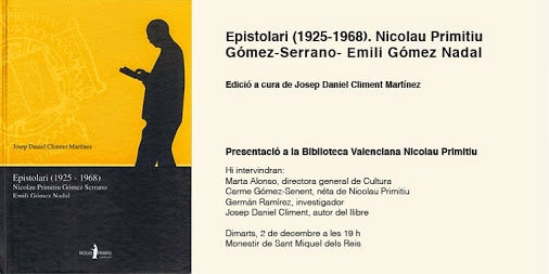 No cal que us diga que ens agradaria comptar amb la vostra presència i mostrar-vos el treball que hem dut a terme al llarg de més de dos anys. L’obra recull la correspondència que van mantenir al llarg de la seua vida Nicolau Primitiu Gómez Serrano i Emili Gómez Nadal, germans per part de pare i destacades personalitats de la vida social i cultural valenciana del segle XX. El primer, prominent empresari, autor d’estudis i investigacions sobre llengua, folklore o arqueologia i gran bibliòfil, tingué un paper públic rellevant des de la dècada del 1930, quan ocupà la presidència de societats com ara Lo Rat Penat o Proa, entre d’altres, fins a la del 1960, quan dirigí el Centro de Cultura Valenciana o fundà l’editorial Sicània. El segon, doctor en Història, professor universitari, activista cultural i columnista habitual en publicacions com Acció Valenciana o El Camí, s’implicà intensament en la vida política activa durant la República, milità en el Partit Comunista i ocupà diversos càrrecs durant la Guerra Civil, i més tard, en l’exili a París, col·laborà amb la Resistència francesa.