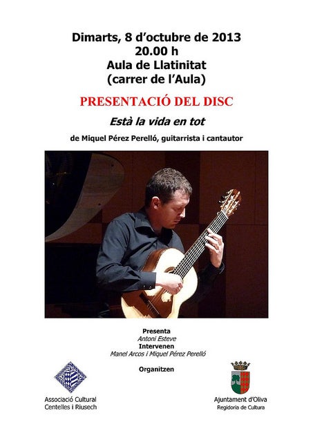 El dimarts 8 d’octubre de 2013, a les 20.00 h, el guitarrista i cantautor Miquel Pérez Perelló presentarà el seu disc Està la vida en tot a l’Aula de Llatinitat d’Oliva (carrer de l’Aula), en un acte organitzat per l’Associació Cultural Centelles i Riusech i la Regidoria de Cultura de l’Ajuntament d’Oliva.