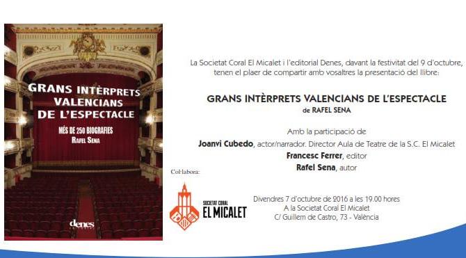 El proper divendres 7 d’octubre, a les 19 hores a la Societat Coral El Micalet, es presentarà Grans Intèrprets Valencians de l’Espectacle, el nou llibre de Rafel Sena.