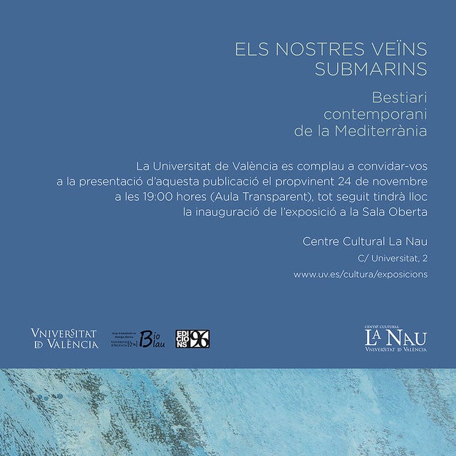 Alhora, “Els nostres veïns submarins. Bestiari contemporani de la Mediterrània” s’inaugura en format expositiu, com un resum del llibre i abastant exclusivament la Mediterrània, al Centre Cultural La Nau.