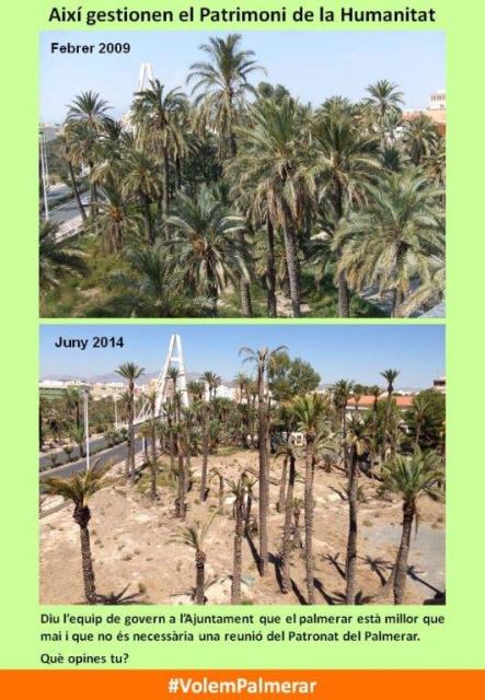 El palmerar d’Elx travessa una crisi greu que fa perillar la seua pervivència com a tal. A la temible plaga del morrut roig i uns altres -com la paysandisia- de les quals no es parla, cal afegir la mala gestió que duu a terme l’ajuntament en els horts municipals i la manca de vigilància sobre els horts privats que hem pogut constatar els últims anys.