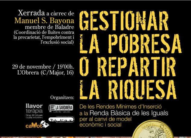 Per això, el proper dissabte 29 de novembre, a les 19.00h, a l’Obrera (c/ major, 16) de Castelló tindrem una xerrada sobre la renda bàsica: De les Rendes Mínimes d’Inserció a la Renda Bàsica de les Iguals.