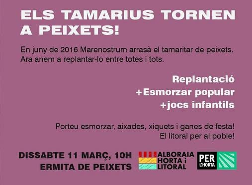 El passat mes de juny durant els treballs preparatoris del macrofestival Marenostrum a l’horta d’Alboraia, les màquines arrencaren una vintena de tamarius de grandària considerable entre el parc de peixets i la zona dunar, en les proximitats del barranc del Carraixet. Per l’Horta i la plataforma «Alboraia, Horta i litoral» pretenem ara recuperar la zona, replantant-la amb dues espècies autòctones, pròpies d’ecosistemes litorals i de ribera de barranc, com són els tamarius (Tamarix Canariensis) i la canya jueva (Arundo Micrantha).