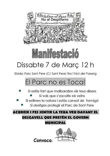 Tal i com es plantejà a la darrera assemblea s’ha sol·licitat “Manifestació” per el proper dissabte 7 de Març a les 12 hores. Eixida des de la porta del Parc (carrer Sant Pere) i acabament a l’inici del Passeig.
