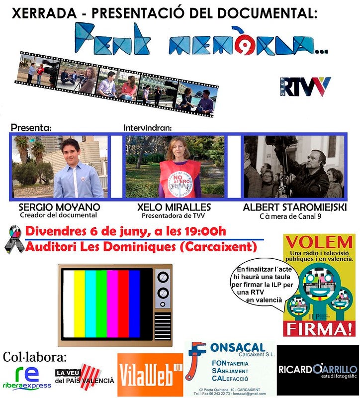 En finalitzar l’acte hi haurà una taula on signar l’ILP pel dret a una Ràdio i Televisió públiques valencianes. Col·laboren en la presentació del documental el diari digital Vila Web, el ciberdiari La Veu del País Valencià, el diari digital comarcal Ribera Express, la fontaneria FONSACAL i l’estudi fotogràfic Ricardo Carrillo.