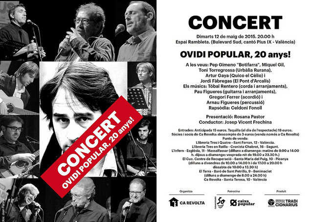Ca Revolta organitza el proper 12 de maig l’espectacle “OVIDI POPULAR, 20 anys!” a l’Espai Rambleta (València), i d’aquesta manera l’entitat valenciana es suma a la commemoració dels 20 anys des que l’Ovidi se’n va anar (com ell mateix cantava) de vacances.