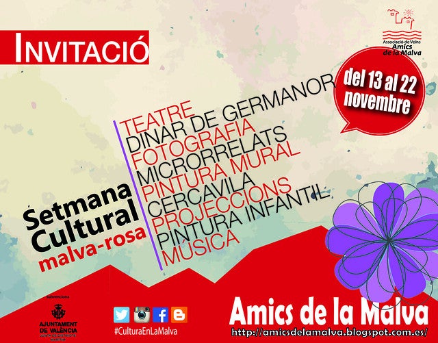 La setmana cultural continua dimarts 17 inauguració de la exposició fotogràfica del concurs de fotografia digital de persones del barri. En la setmana participen diverses entitats del barri com el Grup de Dones amb una representació teatral, Ràdio Malva amb un taller de ràdio per a joves de l’IES Isabel de Villena i un dinar popular, el grup de dolçaina Bufa-li, i les escoles públiques del barri amb creacions artístiques de xiquets i xiquetes de tots els centres educatius públics de la Malva-rosa.
