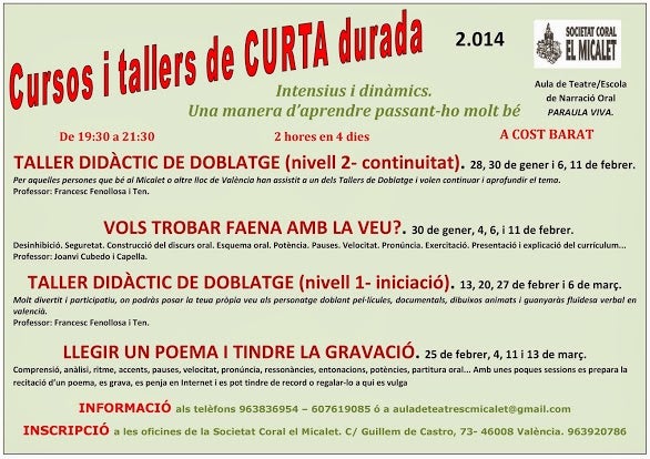 TALLER DIDÀCTIC DE DOBLATGE (nivell 2- continuïtat). 28, 30 de gener i 6 i 11 de febrer.