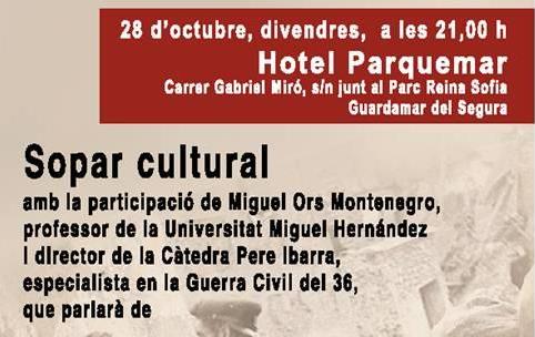 L’Institut d’Estudis Guardamarencs farà l’acte anual del sopar cultural, que és un sopar amb conferència i col·loqui al voltant d’algun tema d’interés.