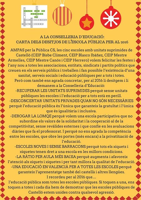 S’apropa la fi del primer trimestre i les festes de Nadal i és l’hora de fer un xicotet balanç dels últims esdeveniments. Podem ser optimistes doncs tenim un nou govern al nostre país que ha començat a canviar algunes coses. Així, tot i alguns problemes deguts la improvisació, ja s’ha fet la campanya de xarxa llibres sense massa entrebancs, també per al proper curs es llevarà el districte únic que tant mal feia a l’escola pública. A més les maneres i la comunicació amb els nous governants autonòmics i municipals han millorat substancialment.