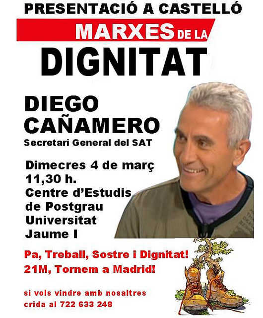 Dimecres, 4 de març, tindran lloc actes de presentació de les Marxes de la Dignitat a Castelló i València. Aquests actes, que comptaran amb la presència de Diego Cañamero, portaveu nacional del SAT, serviran per informar sobre la tornada a Madrid el proper 21 de març. Les Marxes de la Dignitat tornen a Madrid caminant cap a la vaga general amb lobjectiu dexigir una vida amb dignitat. Des de tots els punts de lestat espanyol columnes de dignitat es mobilitzaran per defendre el programa del moviment 22-M com a pas previ a la convocatòria de la mobilització general doctubre concretada en una vaga general laboral, de consum i social.