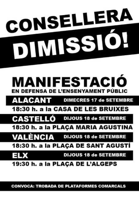 El lema de les manifestacions serà “Consellera dimissió!”, en rebuig a la seua nefasta gestió en educació, clarament evidenciada en aquest inici de curs, amb una aplicació precipitada de la LOMQE -una llei que no vol ningú-, i l’avançament del curs i de les proves de recuperació que han acabat amb la paciència del professorat. A tot això se li ha sumat la intensíssima calor d’aquests dies que ha impossibilitat la impartició de classes amb normalitat.