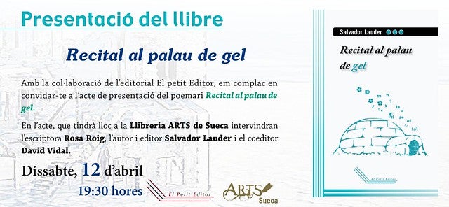 Hui disssabte 12 d’abril, a la llibreria Arts de Sueca, el poeta Salvador Lauder presentarà en societat el seu nou poemari titolat “Recital al palau de gel”. L’acte, que començarà a les 19:30 hores, serà conduït per l’escriptora i engrescadora cultural Rosa Roig. A més a més, intervindrà l’editor i company de l’autor, David Vidal.