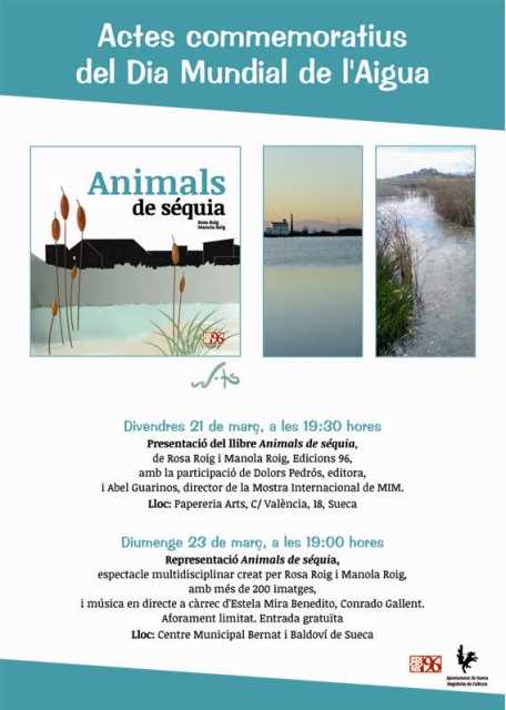 L’Ajuntament de Sueca, a través de la Regidoria de Cultura, commemorarà el Dia Mundial de l’Aigua, amb dues activitats culturals. Divendres 21, a les 19.30 hores, s’oferirà la presentació del llibre Animals de séquia, escrit per Rosa Roig i il·lustrat per Manola Roig, d’Edicions 96. L’acte tindrà lloc en la Papereria Arts i comptarà amb la participació de Dolors Pedrós, editora, i Abel Guarinos, director de la Mostra Internacional de MIM. Per celebrar el Dia Mundial de l’aigua les Germanes Roig volen usar el llibre i l’espectacle que l’acompanya per promoure la declaració de Bé d’Interés Cultural Immaterial per a tota la xarxa de séquies i d’assuts lligats al Xúquer i a l’Albufera.