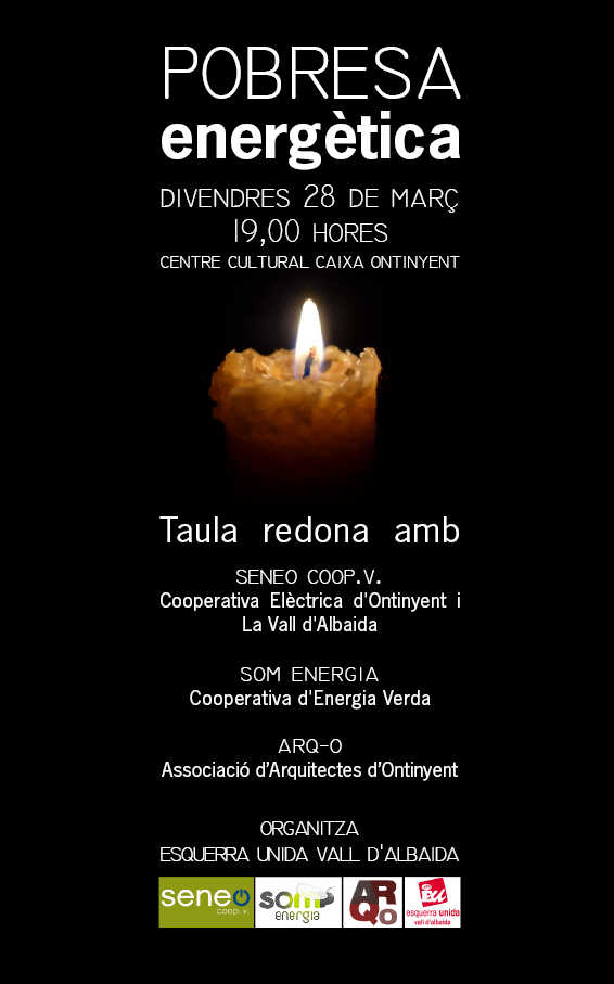 Per parlar d’esta greu problemàtica, coneixer l’opinió d’especialistes en distints camps del món de l’energia, i debatre i buscar solucions a la pobresa energètica, des d’Esquerra Unida de la Vall d’Albaida hem organitzat una taula redona per al proper divendres 28 de març on comptarem amb la presència d’Andrés Montesinos, coordinador de la Secció Territorial de Som Energia València; de Rafa Mira, de l’Associació d’Arquitectes d’Ontinyent; i d’un representant de SENEO, la nova Cooperativa Elèctrica d’Ontinyent i la Vall d’Albaida.