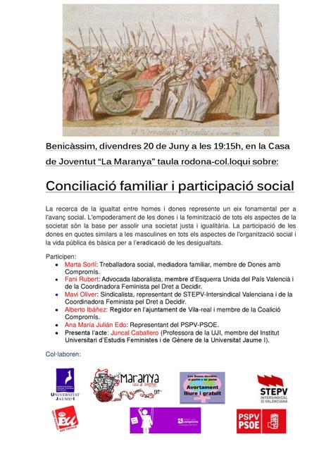 El proper divendres 20 de Juny, a les 19:15h. en la Casa de Joventut La Maranya de Benicàssim, tindrà lloc una taula rodona-col.loqui, en la qual diferents representants de col·lectius progressistes, analitzaran la problemàtica de conciliar, per part de les dones, la seua vida laboral i familiar amb la participació social.