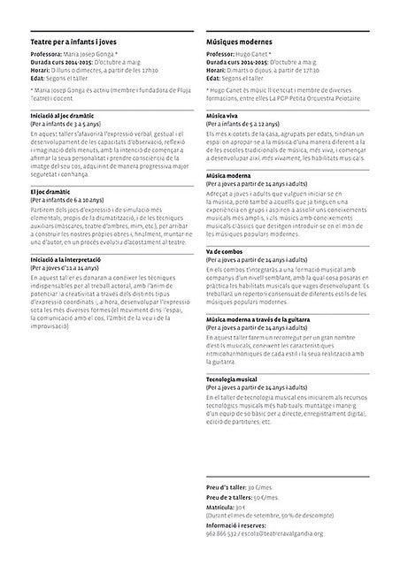 A més, posaran en marxa el Teatre Escola del Raval, amb dos tallers que es desenvoluparan d’octubre a maig amb dos sessions setmanals. Els dos tallers que s’impartiran seran ‘Teatre per a infants i joves’ i ‘Músiques modernes’. Al primer els alumnes aprofundiran en el joc dramàtic i s’iniciaran en la interpretació. Al segon els alumnes comprendran la vivacitat de la música, aprendran coneixements teòrics i pràctics sobre la música moderna per entendre-la millor. En definitiva hom podrà aprendre des de com funcionen els processos de la música popular i moderna fins a muntar un equip de so bàsic.