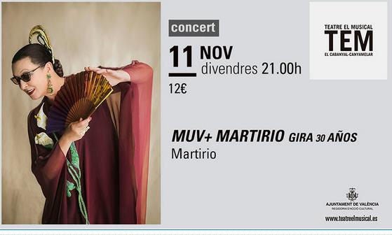 Ulleres de sol, pinta, veu i una força creativa arrolladora han acompanyat durant 30 anys a Martirio, una de les cantants més personals del panorama nacional. Dissabte que ve al Teatre El Musical, Maribel Quiñones (Martirio) farà un repàs a una prolífica carrera en la qual ha compartit projectes amb músics de la talla de Compay Segundo, Chavela Vargas, Lila Downs, Kiko Veneno o Javier Ruibal. Concert en el marc del Festival MUV Circuit de Música Urbana (Muv Fest) de València.