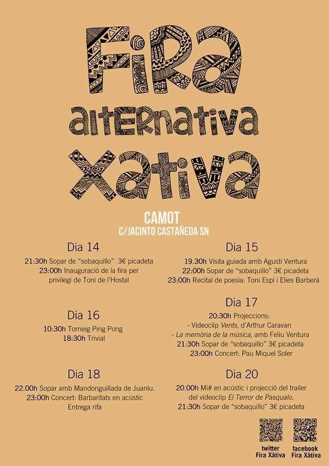 Del 14 al 20 d’agost tindrà lloc la Fira Alternativa de Xàtiva, organitzada per l’associació Amigues i amics de caMot, un grup de gent inquieta que a més d’aquesta fira, durant tot l’any munten un fum d’activitats al seu local situat al centre de la ciutat.